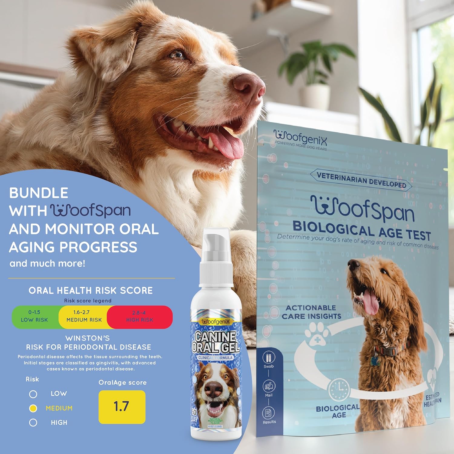 - WoofSpan: Goes beyond age to assess your dog’s biological age, healthspan, and aging risk. WoofSpan delivers insights into your dog’s overall health, evaluates risks for conditions like oral disease and cancer, and offers personalized care plans to help improve their health and slow aging.